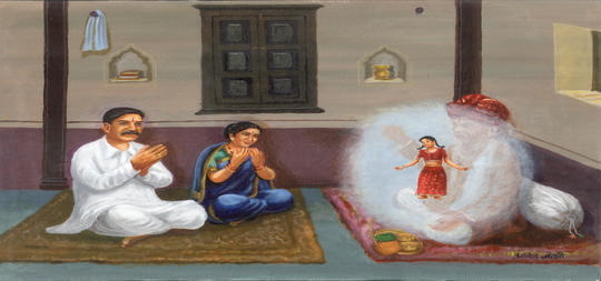 उज्जनला श्रावणी सोमवारी आजोबांकडे आलेल्या महंताना चि.सौ. मथुराने नमस्कार केला.त्यांनी तिला,”तू सिद्धमात्ता होशील.तुला अनेक पुत्र होतील,त्यातील एक पुत्र अलौकिक असा लोकोद्वारक होईल”, असा आशीर्वाद देऊन,नित्य पूजेसाठी महादेवाची पिंड दिली.